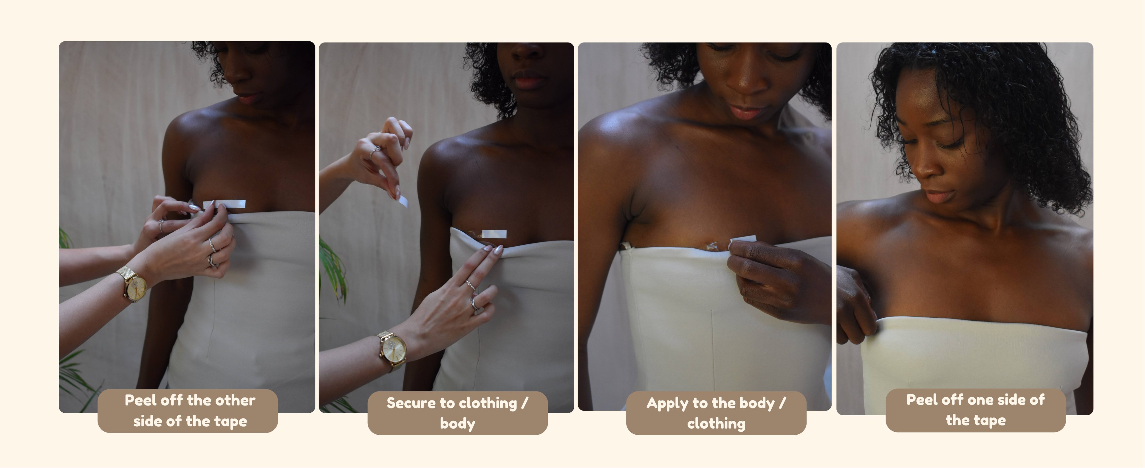 Our double-sided clothing tape is your secret weapon for all-day confidence. Simply apply the tape along the top edge of your top and press it firmly onto clean, dry skin. It keeps your outfit in place, prevents slipping, and smooths out gaps — so you can move, dance, and pose without a second thought.